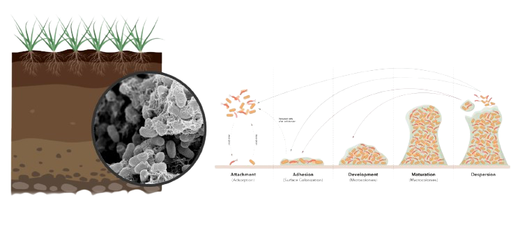 This research focuses on how bacteria grow and behave in soils and similar porous materials. Bacteria produce something called biofilms, slimy protective layers, that help them survive harsh conditions. These biofilms are mostly water and surprisingly, they can be permeable. We are trying to understand how easily water can move through them this is called permeability. The goal is, to better understand these interactions, which can help in fields like water purification, agriculture, and environmental restoration.